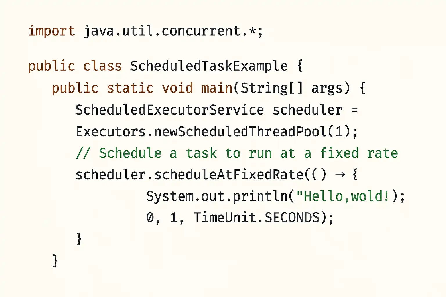 | scheduleAtFixedRate(Runnable, initialDelay, period, unit) | 固定频率重复执行(不考虑上次是否完成) |