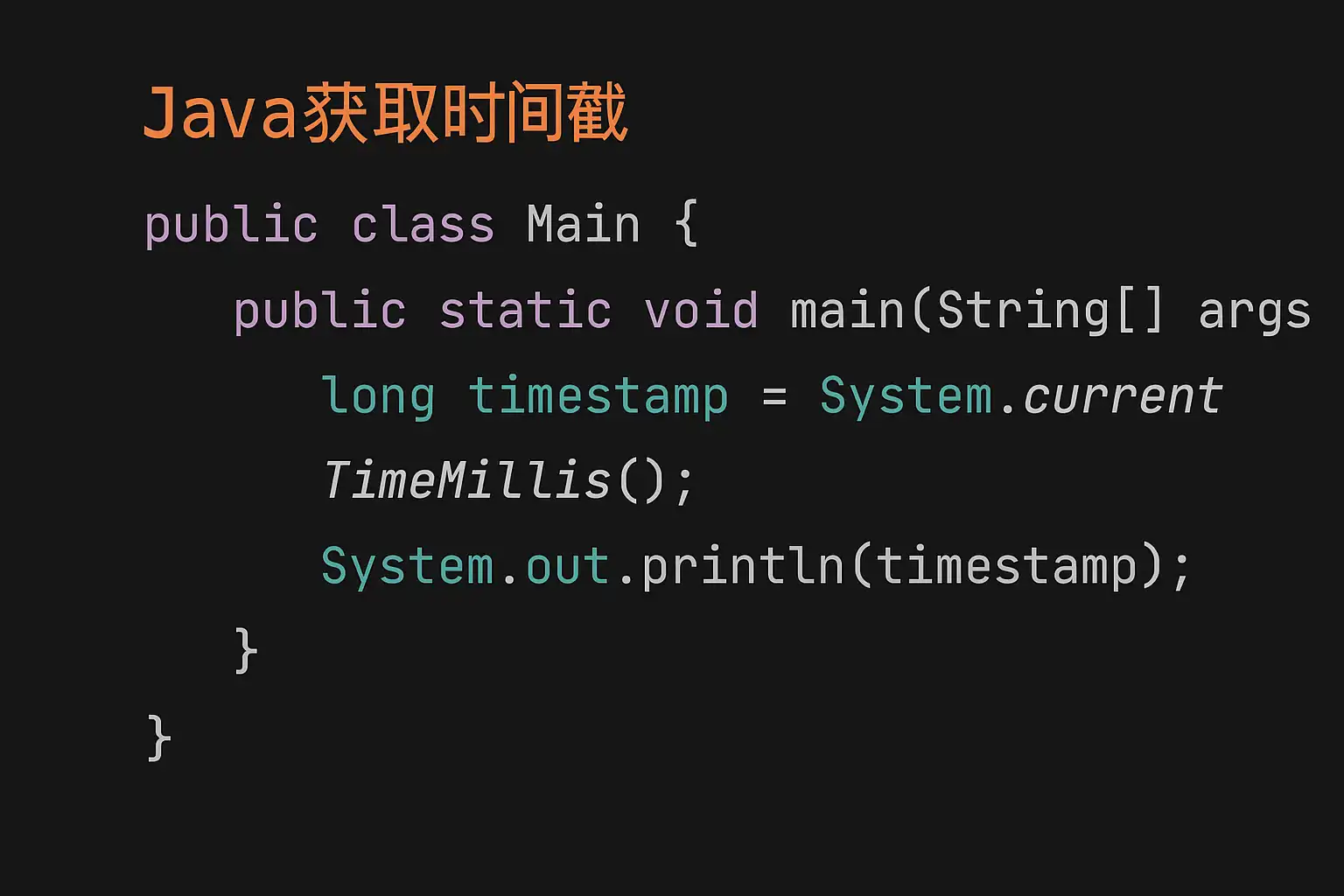 - Instant.now().toEpochMilli()(Java 8及以上):基于java.time包,更现代且线程安全。