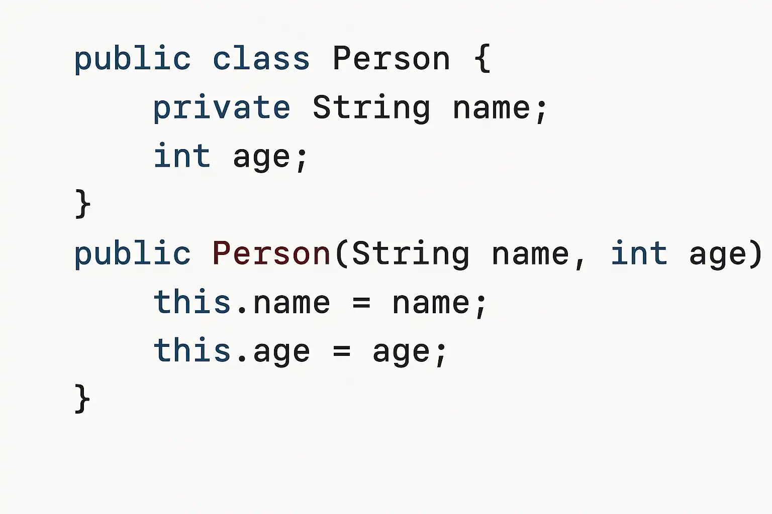| 有参构造器 | 带一个或多个参数,提供定制化初始化 | public Person(String name, int age) \{ ... \} |