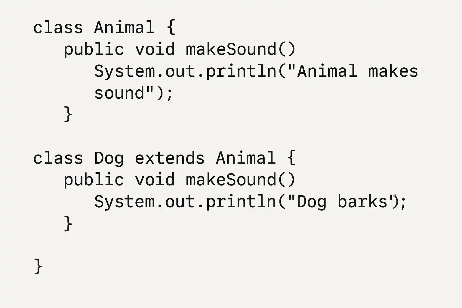 class Dog extends Animal \{@Overridepublic void sound() \{System.out.println("Bark");\}\}