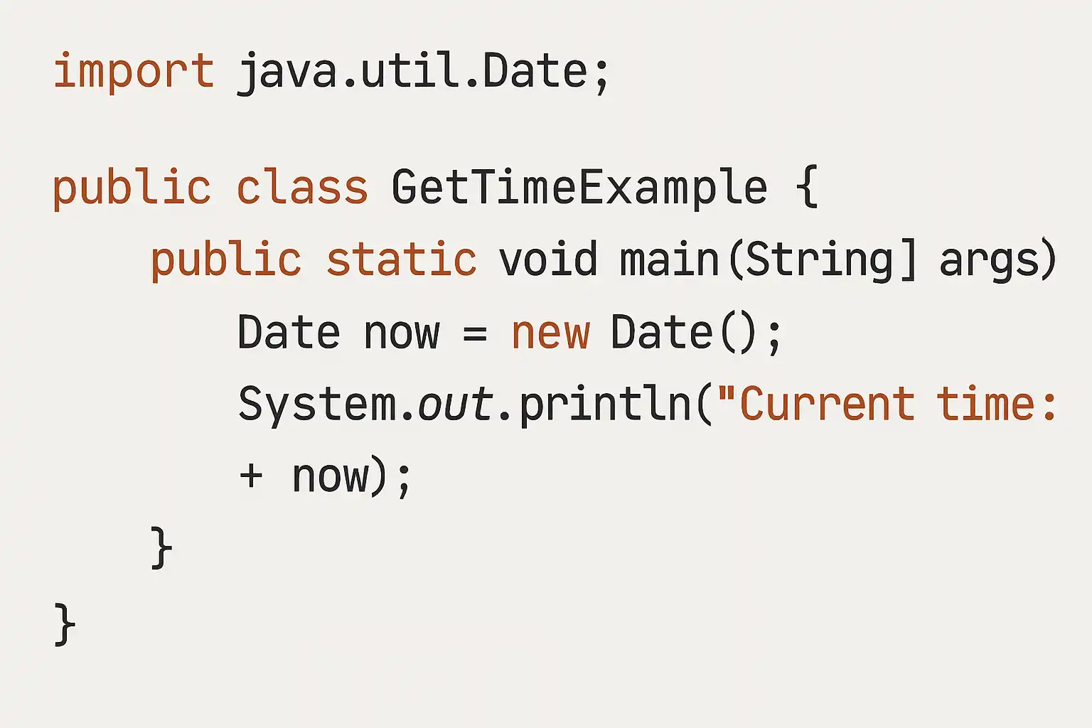 Date date = new Date();System.out.println("当前系统日期和时间:" + date);- 可通过 date.getTime() 获得对应 Unix 时间戳。