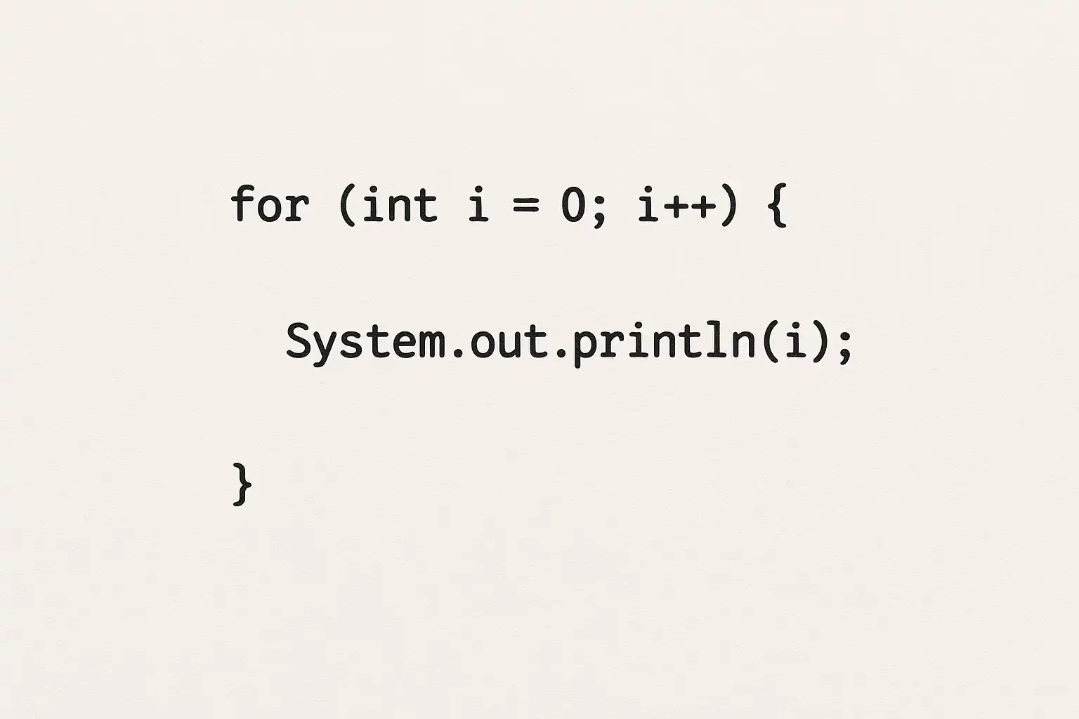 for (int i = 0; i < 5; i++) \{System.out.println("当前i值:" + i);\}上述代码会输出0~4共5行结果。每次i自增1,当i>=5时跳出循环。
