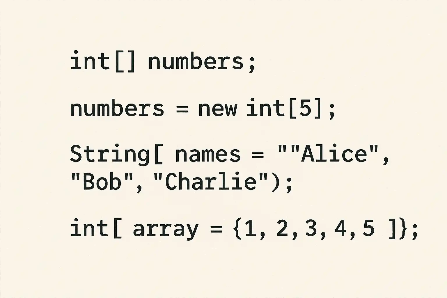 | 静态初始化 | int[] arr = {1, 2, 3, 4, 5}; | 声明并赋初值(无需new关键字) |