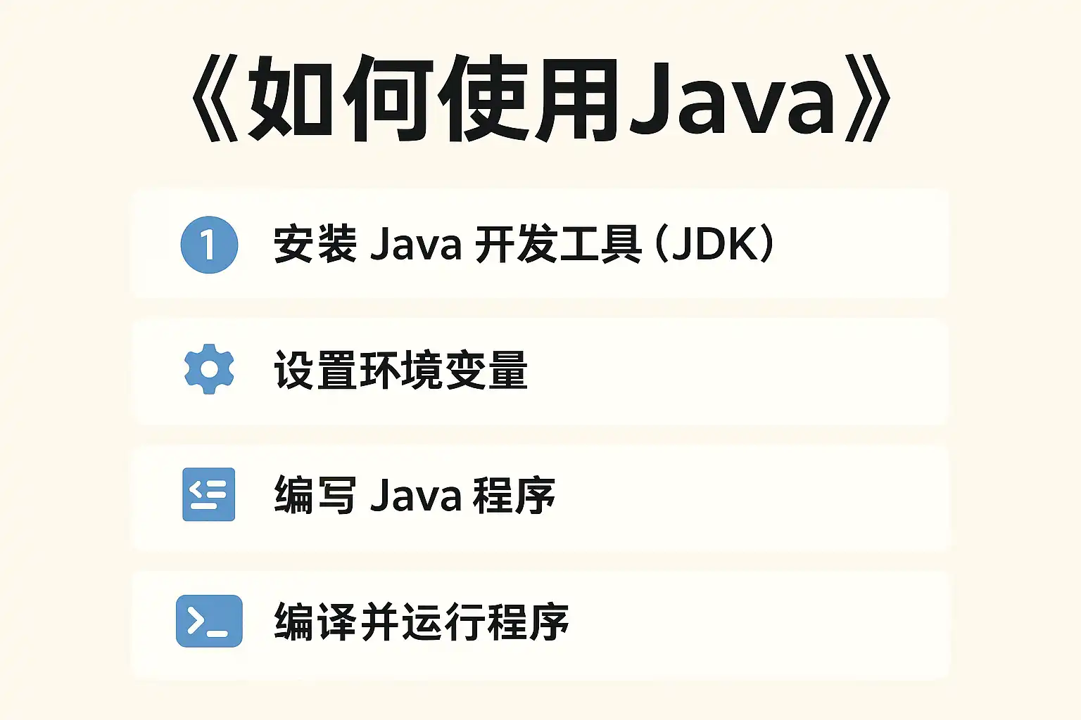 | 3 | 安装集成开发环境(IDE) | IntelliJ IDEA, Eclipse, NetBeans |